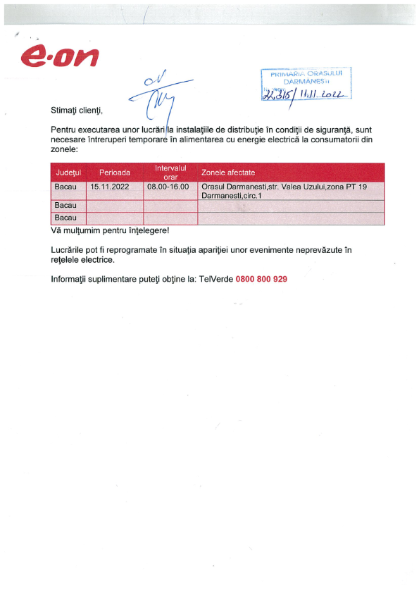 În data de 15.11.2022 în intervalul orar 08:00-16:00, pentru executarea unor lucrări la instalația de distribuție, în condiții de siguranță, sunt necesare întreruperi temporare în alimentarea cu energie electrică la consumatorii din Orasul Darmanesti, str. Valea Uzului, zona PT 19 Darmanesti, circ.1.