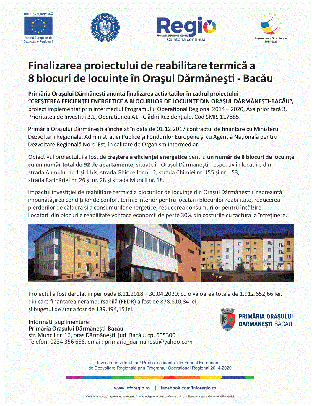 Finalizare proiectului de reabilitare termică a 8 blocuri de locuinţe din Oraşul Dărmăneşti, judeţul Bacău